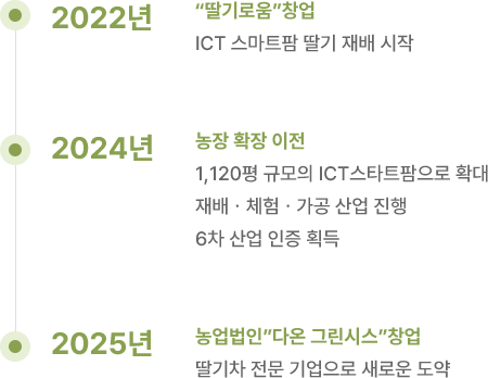 청년 농업인으로 스마트팜을 창업한 후, 1차 재배부터 2차 가공, 3차 체험 서비스업까지 경험하며 딸기에 대한 진심과 열정을 쌓아왔습니다.